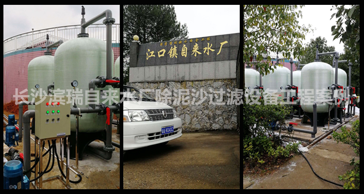 該自來水廠原水從河中抽取,進入蓄水池,進出水管徑DN400,自來水廠用水量大,原水發黃、水中泥沙雜質重,尤其是洪汛時期,必須要有一臺出水量大,效果好的設備對原水進行處理后,方可使用,針對該自來水廠用水需求,長沙濱瑞設計了一套六罐除泥沙設備,以滿足用戶特殊時期的用水需求。該套設備進出水管徑DN80,為三組兩級過濾,三進三出,同時工作,配三臺增壓泵,三組電控,設備內填10噸石英砂,由長沙濱瑞設計制作,根據客戶需求現場安裝調試。