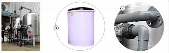 設備組成:全自動控制閥、不銹鋼樹脂罐、加藥鹽箱、連接管件、軟水鹽、陽離子樹脂。